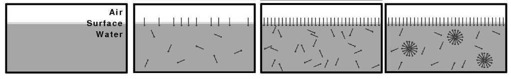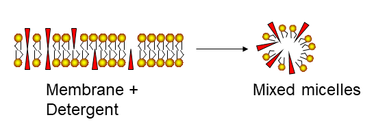 The detergent molecules will initially orient the headgroup towards the water phase and the hydrophobic tail is oriented to the only non-polar phase, the air (Fig. 6). Small amounts can dissolve in water. Upon increasing the concentration, micelles will be formed, which are spheres made up of detergent molecules with head-groups pointed towards the aqueous phase. The micelles are in equilibrium with individual detergent molecules dissolved in water. Membrane lipids and fat are practically insoluble in water. Fat will just float as a mass of fat, while membrane lipids will form membrane bilayers and vesicles. When detergents come into contact with membranes or fat, they can wedge between lipid or fat molecules. Because the polar and in particular charged head-groups repel each other, this will dissolve the membrane and result in the formation of mixed micelles (Fig. 7).