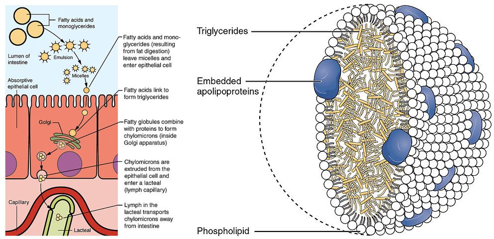- Fatty acids and 2-monoacylglycerol are transported into enterocytes by a variety of mechanisms. Inside enterocytes fat is resynthesised and assembled together with phospholipids and cholesterylesters into chylomicrons. Chylomicrons pass into the lymphatic system and then into the blood stream.