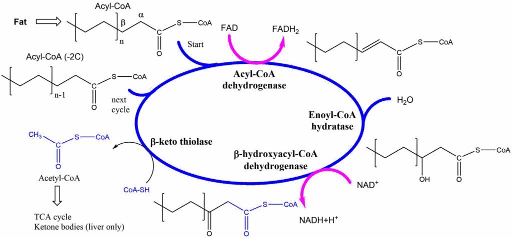 - Fatty acids can be used by many cells to generate energy after conversion to fatty acyl-CoA. They are metabolised through beta-oxidation, a cyclic sequence of reactions which generate acetyl-CoA from each two subsequent carbon atoms. In the process FADH2 and NADH is generated. Further energy is generated by the complete oxidation of acetyl-CoA in the TCA cycle.