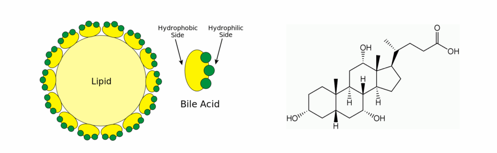 Bile acids are the detergents in our body helping with lipid digestion (Fig. 8). They have a polar and hydrophobic part and thus are mild detergents that can reduce the size of lipid droplets. They are derived from cholesterol.