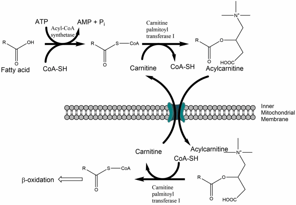 First fatty acids are activated using ATP to generate a chemically activated fatty acyl-CoA. This reaction could be considered the activation phase of beta-oxidation, similar to the activation phase of glycolysis. Carnitine palmitoyl transferase I (CPTI) is located in the outer mitochondrial membrane and catalyses the condensation of carnitine with the fatty acid while CoA-SH is released. Acylcarnitine is transferred into the mitochondria in exchange for carnitine. In the inner mitochondrial membrane CPTII is located, which releases carnitine in exchange for CoA-SH. Thus chemically activated acyl-CoA is reformed within the mitochondria. Please note that the outer mitochondrial membrane contains large pores, which allow the passage of fatty acids, CoA-SH and ATP etc.