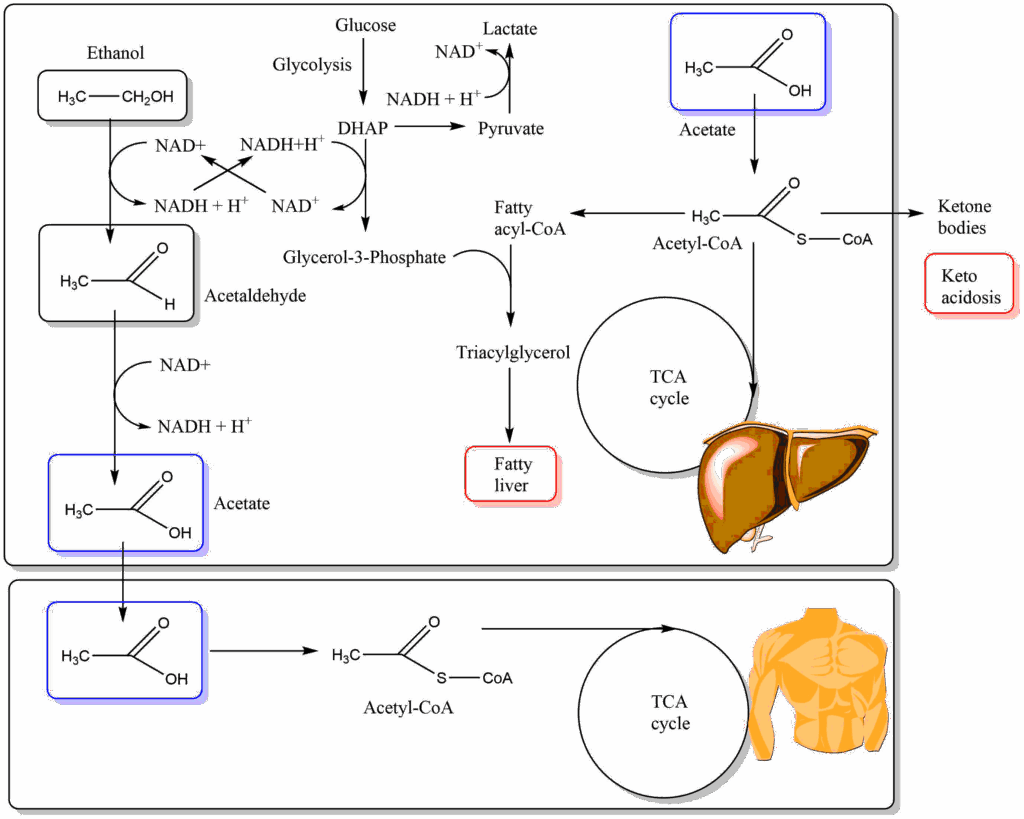 - Alcohol is oxidised into acetate in a two-step process in the liver. Acetate is then converted into acetyl-CoA in many tissues to generate energy or to synthesise fat. The NADH generated by alcohol dehydrogenase in the cytosol leads to synthesis of fat and ketone bodies.