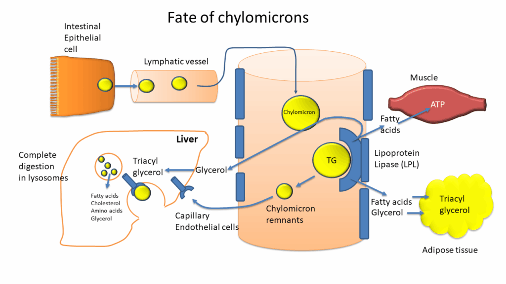 - The content of chylomicrons can be released by lipoprotein lipase, which is found in endothelial cells lining blood vessels. This results in the generation of fatty acids and glycerol, which can diffuse from the blood vessel to tissue cells. Most of the glycerol is used by adipose tissue to form fat for storage or by liver to generate glucose.