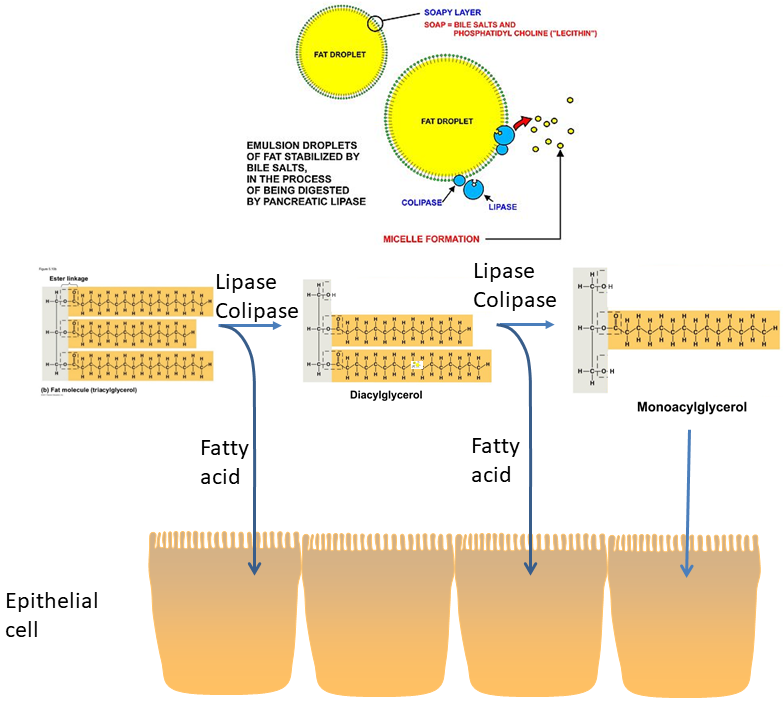 Now that we understand the role of bile acids we can also understand how fat is broken down in the intestine. Lipase is secreted by the pancreas and combines with colipase. Colipase has a hydrophobic face and a hydrophilic face. This allows colipase to bind to bile-acid coated fat droplets (Fig. 9). Lipase can then interact with individual fat molecules and can digest them into two molecules of fatty acid and a molecule of 2-monoacylglycerol.