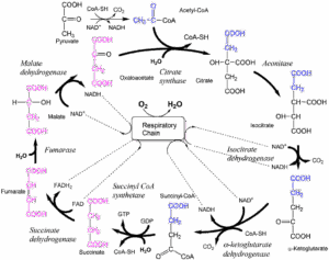 Metabolism of ethanol generates NADH in the liver cytosol (alcohol dehydrogenase) and also inside mitochondria (aldehyde dehydrogenase). As shown in Fig. 15 NADH generated in the cytosol leads to the conversion of glycolysis intermediate dihydroxyacetone-phosphate (DHAP) to glycerol-3-phosphate, which is one of the building blocks to make fat. In addition acetate can be converted to acetyl-CoA also in the liver, which is the second building block to make fat. Thus chronic alcohol intake generates fatty liver. It also acidifies the blood through generation of lactate (pushed by NADH in the cytosol) and ketone bodies. Mitochondrial NADH will cause the TCA cycle to slow down, further pushing the generation of fat and ketone bodies. Elevated levels of NADH will move the pyruvate/lactate and oxaloacetate/malate ratios towards malate and lactate and thereby remove intermediates for gluconeogenesis (pyruvate and malate). Hypoglycemia is a potentially dangerous complication of alcohol addiction.