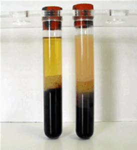The right sample shows blood after a fatty meal. Chylomicrons generate a milky suspension. The sample on the left is from a fasting person. It is clear.
