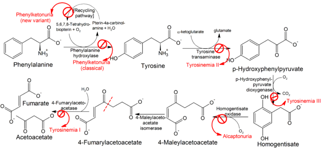 Amino acids are precursors for neurotransmitters. Imbalances of plasma amino acid levels can have a profound impact on mental health. Phenylketonuria (PKU) is an inborn error of metabolism and is caused by mutations of phenylalanine hydroxylase, the first enzyme needed for the breakdown of phenylalanine, converting it to tyrosine (Fig. 10). Tyrosine itself is a precursor for neurotransmitters dopamine, noradrenaline and adrenaline. Otherwise tyrosine is broken down into fumarate (TCA cycle) and acetoacetate (ketone body).