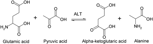 Alanine is released in significant amounts by muscle cells (see below). When it is taken up by the liver it transfers its amino group onto oxaloacetate forming aspartate and pyruvate. In this reaction an amino-group is transferred to a ketoacid and vice versa. As a result it is called an aminotransferase or transaminase reaction. The same reaction is used in muscle to generate alanine using amino-groups of other amino acids (Fig. 6).