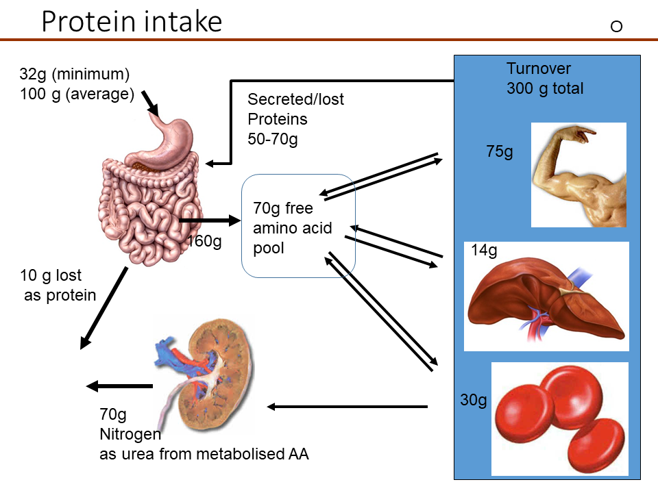 However, ten times more, namely 300g of protein is hydrolyzed and synthesized every day. For example, digestive enzymes are released from the pancreas, which after self-digestion get absorbed together with nutrient protein as amino acids. Another secretion of the intestine are mucins that allow the food to slide along the wall of the intestine. There is constant turnover of protein in muscle, liver, blood cells and to a smaller extent in other organs. Ingestion of 100 g protein results in the absorption of 160 g protein due to the secretion of 70 g protein into the intestine; 10g is lost in the feces. Protein intake in excess of the minimal requirement is used to generate energy, resulting in the generation of urea. Thus, 70g is lost as urea nitrogen while the remaining 30g are used to replenish protein.