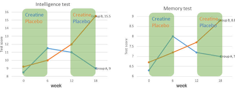 In a study be Rae and colleagues two groups were given creatine or a placebo supplement in a cross-over design. An intelligence test and a memory test were performed every 6 weeks. Increase of performance was observed after 6 weeks of creatine supplement, but not when placebo was given.