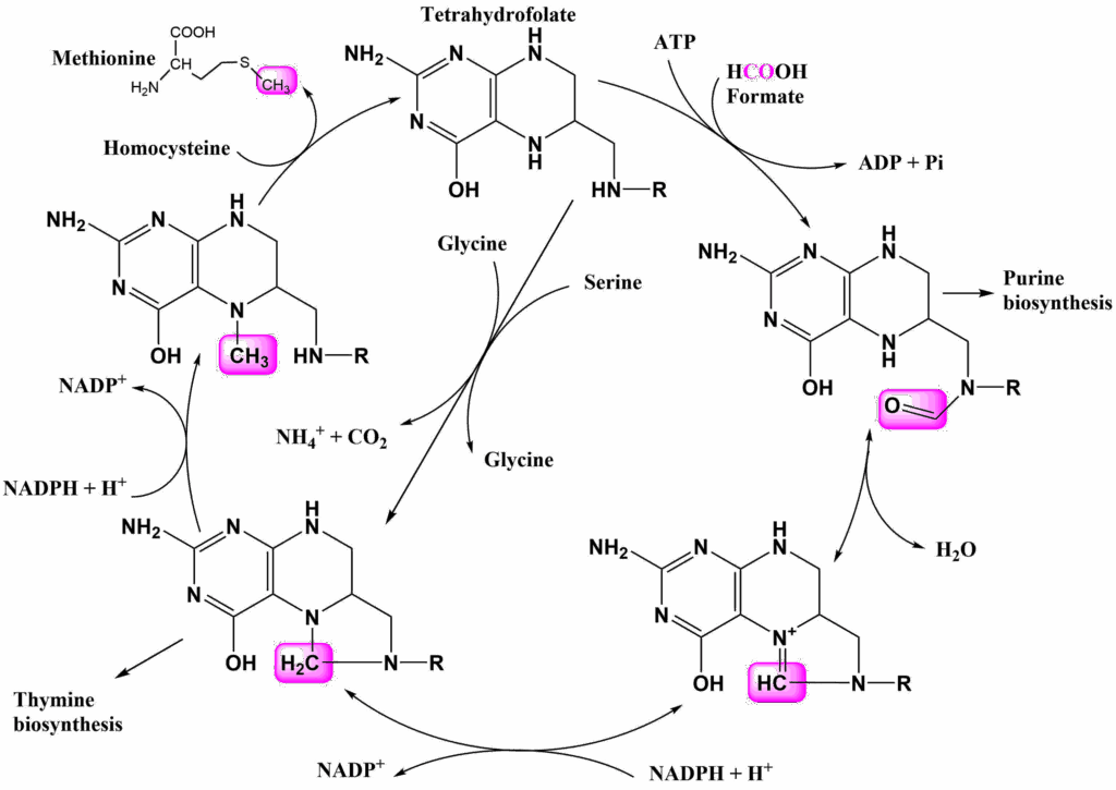 Tetrahydrofolate is a vitamin required for C1 compound transfer. It forms covalent bond with a hydrocarbon in different oxidation stages (methyl-, methylen-, methenyl-,formyl-). These can be transferred to other organic molecules for biosynthetic reactions.
