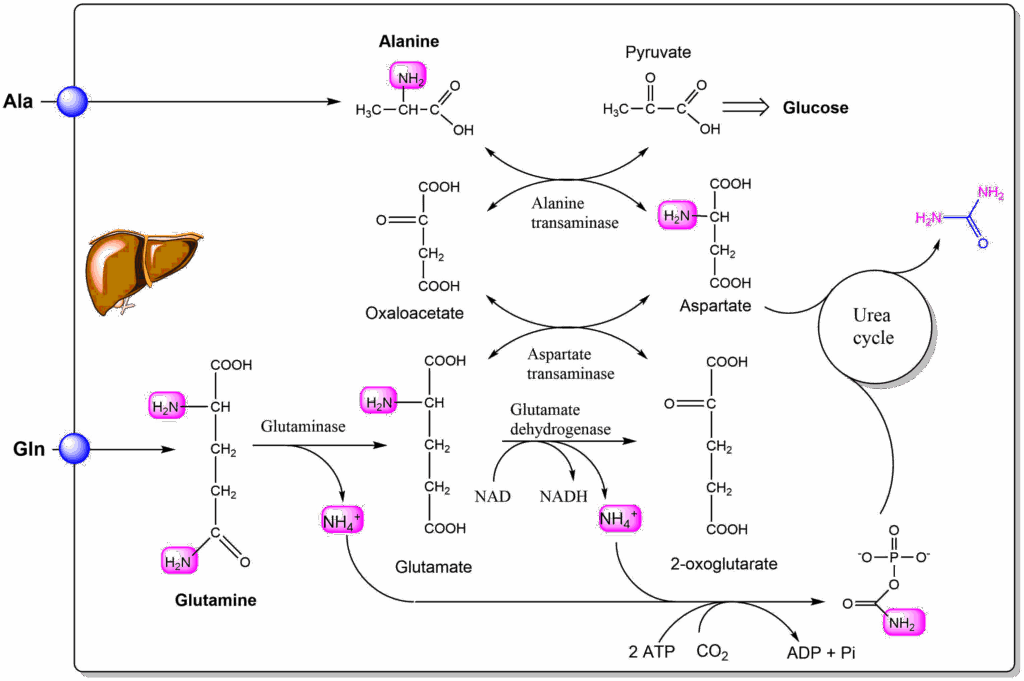 Nitrogen is removed from amino acids either as ammonia, or by transfer of its amino-group onto keto-acids (aminotransferase or transaminase reaction). Either way, the nitrogen is transferred onto alanine or glutamine, which through blood circulation come to the liver. Ammonia can also directly be transferred to the liver where it is captured by glutamine synthetase (Glutamate + ATP + NH4+ → Glutamine + ADP + Phosphate). Alanine and glutamine are extracted by the liver and the nitrogen is transferred onto aspartate or released as ammonia (glutamine synthetase is absent in the liver cells that make urea). Aspartate and ammonia deliver nitrogen to the urea cycle and the final product urea contains one amino-group from each source. Final deposition of urea occurs in the kidney, but the urea cycle, is only active in liver (Fig. 4).