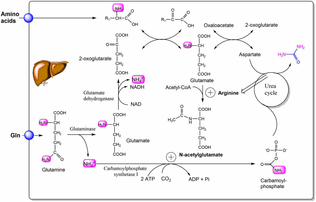 Although liver does not remove glutamate from the circulation, amino acid intake by the liver, quickly increases hepatic glutamate levels due to the transaminase reaction using 2-oxoglutarate as an acceptor, which in turn is generated from glutamine intake. Glutamate reacts with acetyl-CoA to form N-acetyl-glutamate. This also probes whether enough nutrients are present to generate acetyl-CoA (fat and carbohydrates). The formation of N-acetyl-glutamate itself is also allosterically regulated by arginine. This provides a positive feedback loop from the urea cycle. Once nutrient intake is over, the activity of both reactions quickly subsides.
