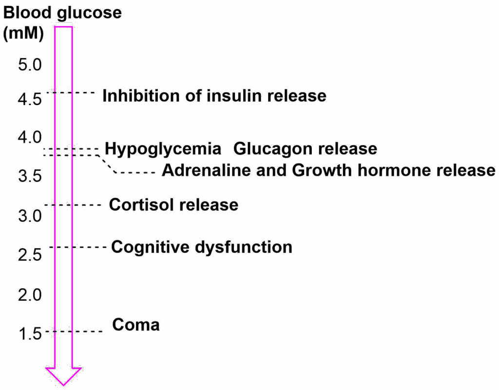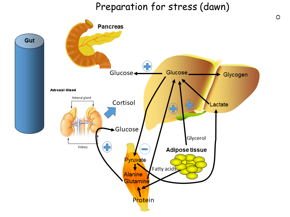 While our body nowadays has to fight with nutrient excess, evolution has selected for very strong responses to nutrient limitation (Fig. 6). Adrenaline, growth hormone and cortisol are released when blood glucose levels fall too low but are also released in the morning to prepare us for the day. We have already looked at metabolic responses to adrenaline above.