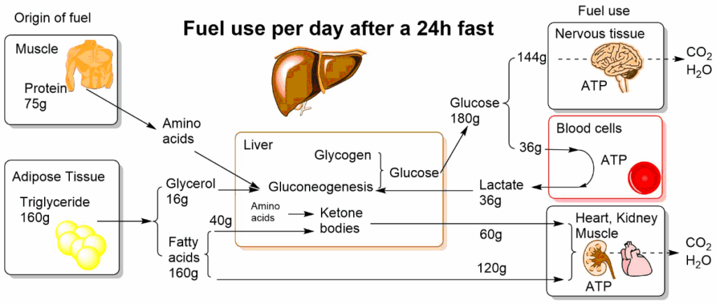 Once all nutrients are deposited and metabolized after a meal, which typically takes 2-4h, blood glucose levels return to normal. Fig. 4 summarizes the use of fuel after a 24h fast. During the day we replenish nutrients every 4h or so but between dinner and breakfast our body has to mobilize reserves to maintain blood glucose. The use and provision of fuel after 24h of fasting is shown in Fig. 4. Adipose tissue and muscle are the providers of fuel. Muscle amino acids are used for gluconeogenesis and Adipose fat is used to provide fatty acids and glycerol. Fatty acids can be used as fuels particularly by the heart and muscles. In the liver fatty acids are converted into ketone bodies, which can be used by any organ. Glycerol is converted into glucose. Glucose is the main fuel for the brain and blood cells and is derived from gluconeogenesis and glycogen.
