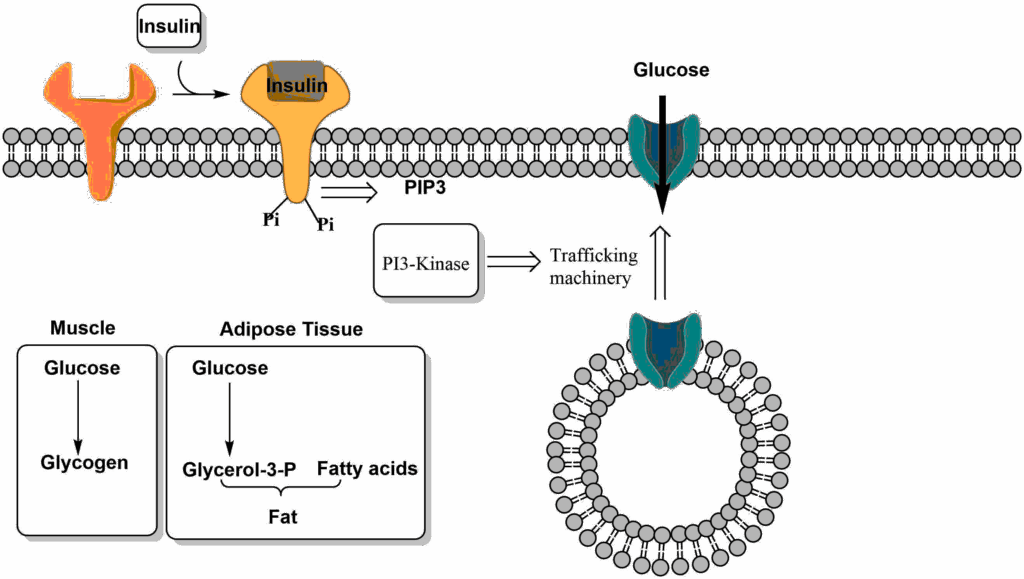 In the fed state all three macronutrients are absorbed by the intestine and reach the liver through the portal vein. Depleted glycogen stores are refilled. Excess glucose passes through the liver and is used by other tissues. In particular, glucose is taken by muscle to refill glycogen stores and by adipose tissue for the generation of glycerol-3-phosphate, the backbone for fat biosynthesis. In the liver excess glucose is converted into fat and delivered to other organs as VLDL particles. The efficient removal of glucose by these mechanisms underlies the drop of blood glucose back to fasting levels within 2-3 h after a meal with muscle being the major sink. The other macronutrients are also stored. The intestine packages fat into lipoprotein particles called chylomicrons, which are transferred to adipose tissue and muscle for storage. Amino acids are used to synthesize protein; excess amino acids are oxidized to generate energy. This metabolic program is governed by insulin. Insulin also initiates the use of glucose by muscle and adipose tissue after a meal by bringing their glucose transporters to the cell surface (Fig. 3). Between meals, glucose transporters are stored in vesicles below the plasma membrane. Binding of insulin to its receptor initiates the insulin pathway (chapter 8), which activates PI3-kinase (Phosphatidylinositol-3-kinase). Via a variety of proteins, the trafficking machinery is activated resulting in fusion of the vesicles with the plasma membrane (Fig. 3). Mice lacking this insulin-responsive glucose transporter are highly insulin resistant, because they cannot efficiently remove glucose from blood.