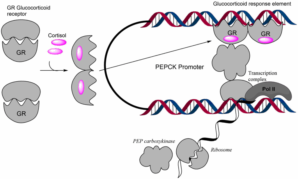 However, when cortisol is released, glucagon has already activated gluconeogenesis through allosteric mechanisms and protein phosphorylation. But we can increase gluconeogenesis even further by increasing the production of enzymes involved in gluconeogenesis. Glucocorticoids bind to the glucocorticoid receptor, which is a DNA-binding protein. The receptor dimerizes and activates gene promoters that contain a glucocorticoid response element (GRE), by recruiting and activating the transcriptional machinery (Fig. 8).