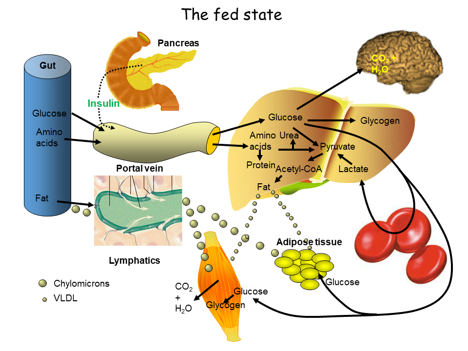 In general, insulin controls nutrient deposition after a meal (the fed state, Fig. 2), while glucagon mobilizes fuel reserves in the post absorptive state (fasting state, Fig. 4). Easy to remember is that insulin polymerizes nutrients (glucose -> glycogen, amino acids -> protein, acetyl-CoA -> fat) and glucagon does the opposite.