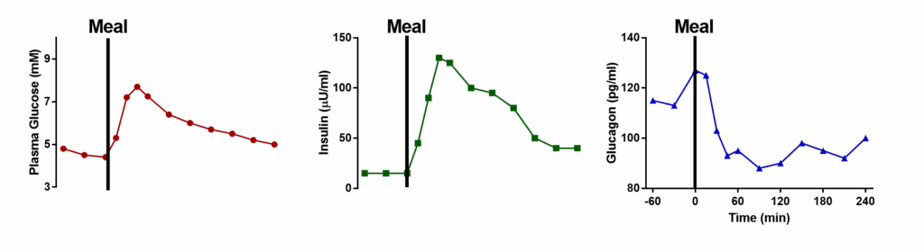 We have looked at many metabolic pathways that control breakdown and synthesis of metabolites. In this chapter we want to integrate these pathways into a bigger picture of metabolic control and appreciate what can go wrong. Fig. 1 shows the course of plasma glucose and the changes of two major hormones (insulin and glucagon) after a meal. Please note that neither insulin nor glucagon ever goes all the way to 0. Both hormones are constantly released to some extent. It is rather the insulin/glucagon ratio that controls fuel metabolism.