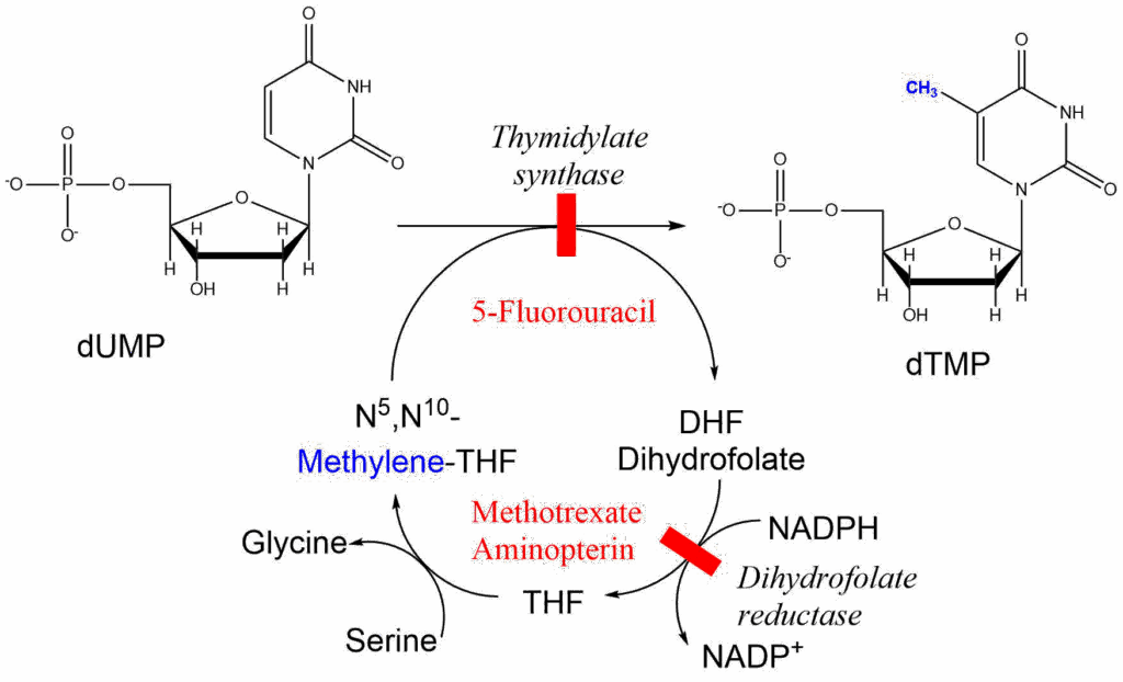 Aminopterin has been superseded by methotrexate; both are inhibitors of dihydrolofate reductase which converts dihydrofolate (DHF) back to tetrahydrofolate (THF). The C1-compound is recharged through serine conversion into glycine. Please note that the methylene-group when attached to THF has a different oxidation state than the methyl-group attached to thymine. As a result, THF is converted to DHF and needs to be reduced by NADPH back to THF. Thus, DNA synthesis also requires significant amounts of NADPH, which together with ribose-5-phosphate (Fig. 3) can be provided by the pentose-phosphate pathway (PPP). As a result, the PPP is more active in a growing cell than in a differentiated cell (see Fig. 5 for compounds that reduce PPP activity).