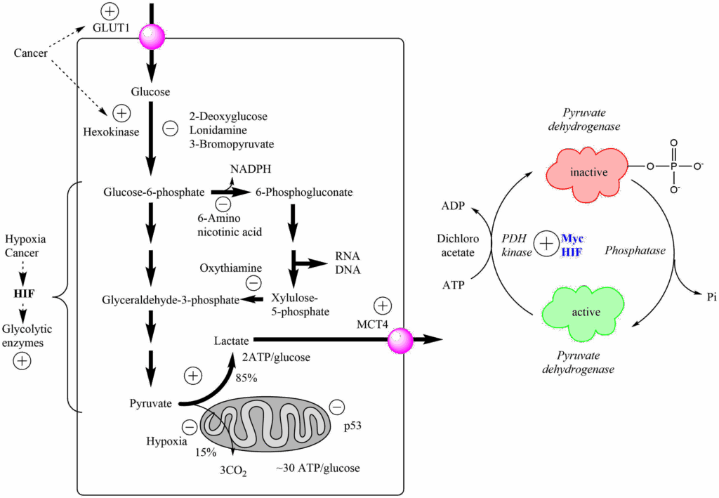 This metabolic program (the Warburg effect) is switched on in cancer cells even in the presence of oxygen, due to increased expression of the transcription factors Hypoxia induced factor (HIF) and the myc oncogene, which in turn increase expression of pyruvate dehydrogenase kinase (PDH-kinase). PDH-kinase phosphorylates and inactivates pyruvate dehydrogenase (Fig. 5). Some cancer drug candidates are listed in Figure 5 that target different steps of glycolysis or the PPP, but none of these has been very successful in clinical trials. However, the large flux through glycolysis is used diagnostically to detect cancers and to monitor treatments (see case study below). In this case 2-[18F]Fluoro-2-deoxyglucose (FDG) is used as a positron emission tracer (PET) to detect tissues with high glycolytic activity. FDG is converted by hexokinase into 2-[18F]Fluoro-2-deoxyglucose-6-phosphate and thus trapped inside the cell (see chapter 7) but cannot be metabolized further.