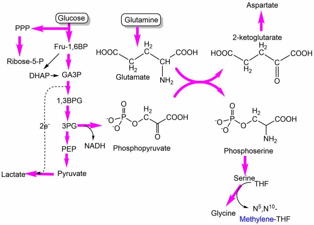Phosphopyruvate is an acceptor for amino-groups allowing transamination of glutamate to 2-ketoglutarate, while it becomes phosphoserine. Phosphoserine is dephosphorylated to serine, which can be converted to glycine to generate N5,N10-methylene-THF. The 2-ketoglutarate can go into the glutaminolysis (TCA cycle) pathway to produce aspartate.