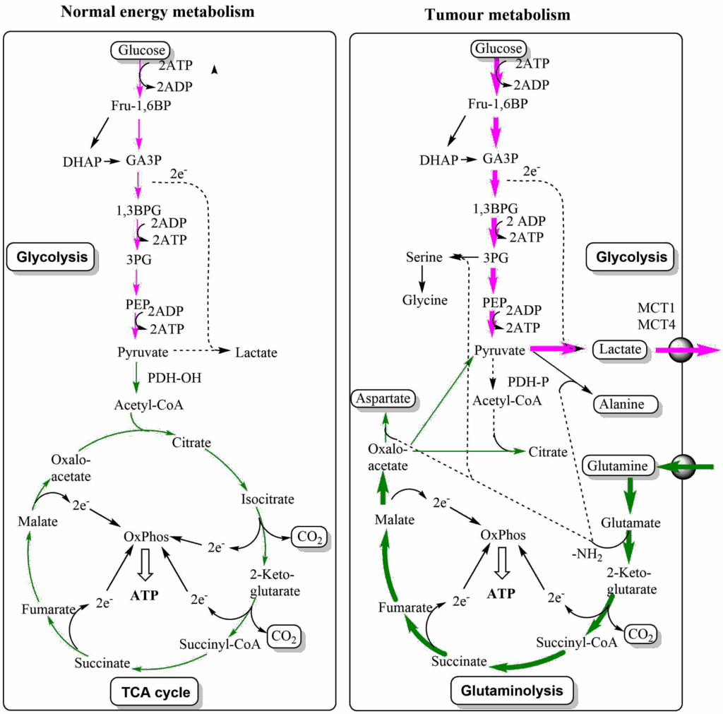 The high activity of the PPP would perhaps suggest that glycolysis is slower in cancer cells, but the opposite is the case. This is called the Warburg effect after its discoverer Otto Warburg. It is caused by a suppression of pyruvate dehydrogenase activity in cancer cells (Fig. 5). Thus, pyruvate does not get fully oxidised, and instead is converted into lactate to recycle NADH. Remember that the yield of ATP in glycolysis is much lower (2 ATP/glucose) than that achieved by mitochondrial respiration (36 ATP/glucose) and as a result metabolic flow through glycolysis increases significantly to provide enough ATP. This metabolic adaptation is typically switched on by lack of oxygen (hypoxia). This can occur where limited number of blood vessels restrict the flow of oxygen to cells, such as in a solid tumour where blood vessel growth has not yet occurred. Remarkably, tumours can only grow to a few millimetres in size in the absence of blood vessels. However, cancer cells still show the Warburg effect even in the presence of oxygen.