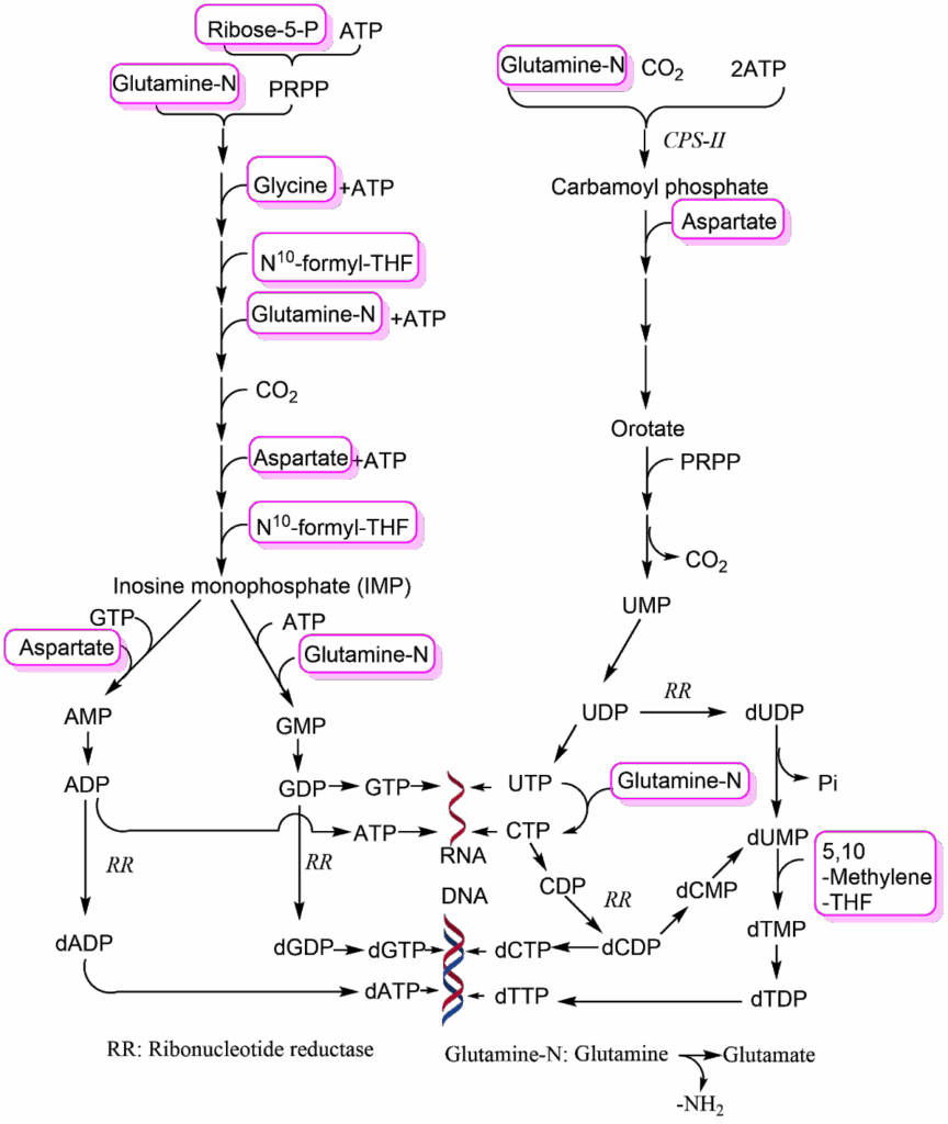 Glutamine several times donates its nitrogen for the synthesis of nucleobases. It is also the precursor to generate aspartate, which is also required for nucleotide biosynthesis. Glutamine generates energy by feeding into the TCA cycle and also produces other amino acids and citrate for fatty acid biosynthesis through the glutaminolysis pathway.