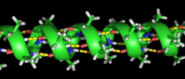 When the peptide is threaded like a helix and one turn takes about 4 amino acids, the carbonyl-oxygen (C=O) can form a hydrogen bond (yellow in Fig. 3) with a Nitrogen-Hydrogen (N-H) of the residue four positions further on or behind. This structure is very stable, because the amino acids do not need to find other partners to interact with. As a result, most proteins have a good proportion of amino acids forming alpha-helices. Important to note: In an alpha-helix side chains point away from the centre of the helix (Fig. 3) avoiding steric problems. Another structure that proteins can form readily is the beta-sheet (Fig. 4).
