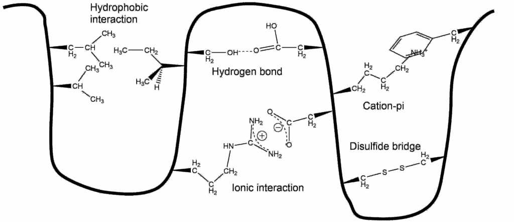 - Secondary, tertiary and quaternary structures are held together by different molecular interactions, such as hydrogen bonds, hydrophobic effect, ionic interactions, cation-pi interactions and disulfide bridges.