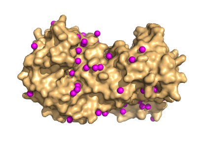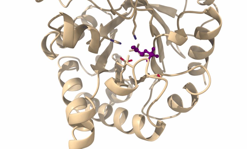 In Fig. 8 you can see key residues (with reactive atoms in blue and red) forming the active site of triosephosphate isomerase. They emanate from different helices and sheets of the protein. The substrate (purple) is located in the centre of the active site.