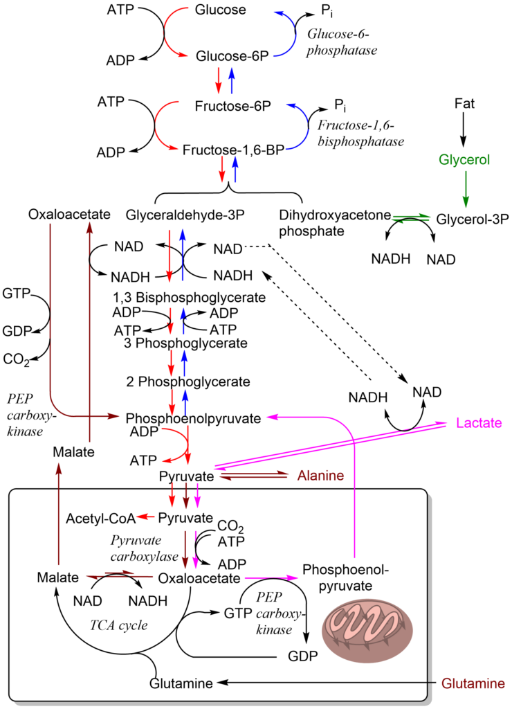 When alanine is used to generate glucose (during the night while sleeping, follow brown and blue arrows), pyruvate is mainly generated by transamination of alanine, which does not generate NADH. In this case (brown pathway) pyruvate is converted to malate. Although this reaction is part of the TCA cycle, its equilibrium favours generation of malate. Malate can then leave the mitochondria and is used to generate NADH by conversion back to oxaloacetate. Cytosolic PEP carboxykinase finally generates phosphoenolpyruvate (PEP) to merge with the common gluconeogenesis reactions (blue). Glutamine can be converted to malate through the TCA cycle, it is mainly used by the kidney to generate glucose. Glycerol, derived from fat, can be used directly for gluconeogenesis because no NADH is required. First it is phosphorylated to glycerol-3-phosphate, then glycerol-3-phosphate is oxidised by NAD to the gluconeogenis/glycolysis intermediate dihydroxyacetone phosphate (green pathway) generating NADH. Only a few organs can generate glucose for systemic glucose homeostasis, namely the liver and kidney. Gluconeogenesis by the intestine is disputed but it expresses the key enzyme glucose-6-phosphatase. Muscle can carry out some gluconeogenesis (without releasing glucose) to reform glycogen from lactate during recovery, but most of the lactate is removed by the circulation and converted into glucose by the liver. In terms of contribution of different pathways to glucose production (measured in mice) during fasting the order is glycerol > glycogenolysis = lactate > glutamine = alanine.