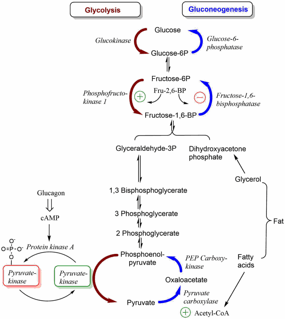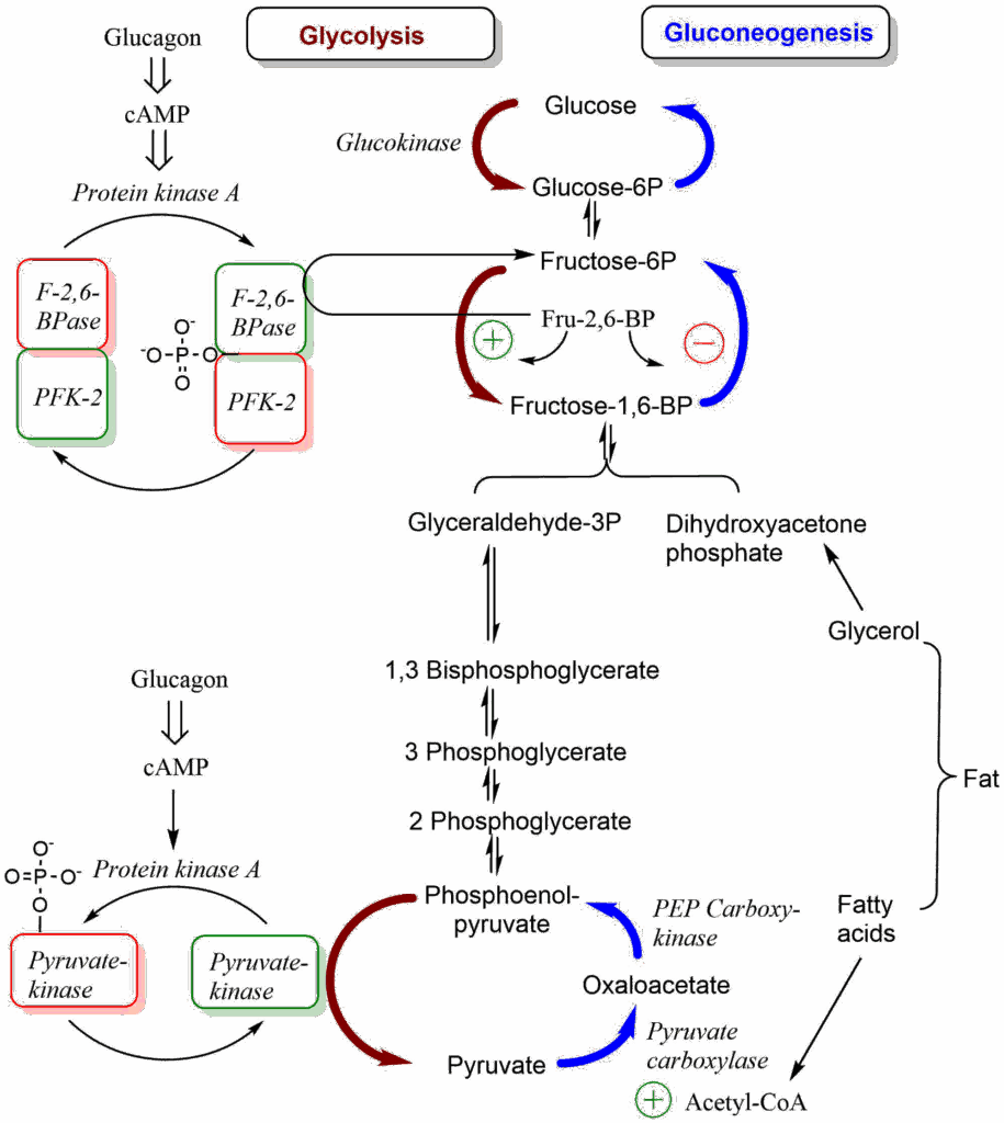 In organs that can carry out gluconeogenesis, we need to avoid that glycolysis and gluconeogenesis run at the same time. This is called a futile cycle, because glycolysis breaks down glucose and these products can be used as substrates for gluconeogenesis reforming glucose. Such a cycle does not generate useful metabolic intermediates but hydrolyses ATP. You can see this by looking at the first three reactions  in Fig. 3 running down the red arrows and returning via the blue arrows. So what prevents the two pathways from running at the same time?