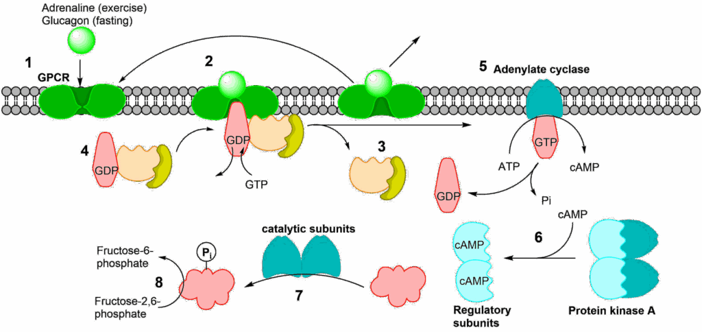 Fig. 7 shows the sequence of events. (1) Glucagon (the first messenger) binds to its receptor at the cell surface. This particular class of receptor is called a G-protein coupled receptor (GPCR). The term G-protein refers to a group of proteins that can bind GDP or GTP and are regulated by these nucleotides. In their inactive form GDP is found in the binding site. When GTP is in the binding site they are active, but GTP is slowly hydrolysed to GDP. After binding of glucagon a conformational change occurs in the receptor, opening a binding site for a G-protein on the cytosolic side. When the G-protein binds to the receptor, GDP is released and exchanged for a GTP molecule (2). This causes the heterotrimeric G-protein complex to fall apart (3). The complex will reform once GTP in the alpha unit has been hydrolysed to GDP (4), thereby resetting the whole system. The hydrolysis is slow to allow the signal to last for a while. The alpha unit, which binds the GTP is now activated and can interact with other proteins, most notably adenylate cyclase (5). Adenylate cyclase is activated by this process and catalyses the conversion of ATP to cyclic-AMP (cAMP, the second messenger); cAMP in turn activates protein kinase A (6). The activation is caused by cAMP binding to the regulatory subunits, which then dissociate from the catalytic subunits (7). The liberated catalytic subunits can now phosphorylate the final target, the bifunctional enzyme fructose-2,6-bisphosphatase/phosphofructokinase 2 (8). Before we look at this enzyme watch the video below.