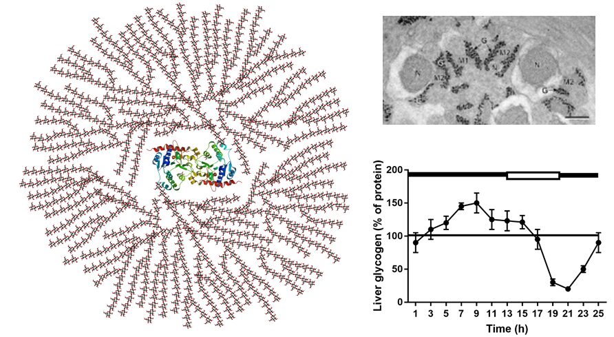 Fig. 9 Glycogen. Left panel principal structure of glycogen showing its branched chains of glucose units. Top right, electron micrograph of glycogen particles (G). Bottom right, liver glycogen in mice during feeding and resting periods in mice.