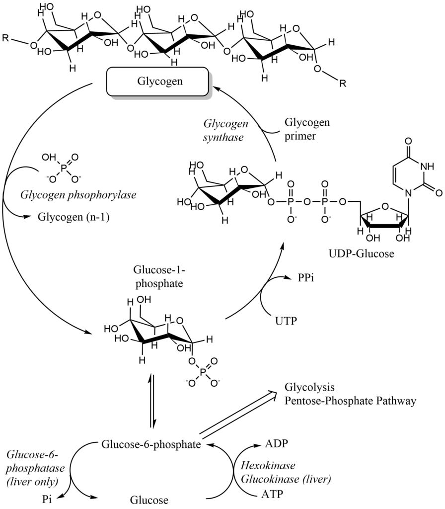 How does glycogen build-up and degradation work? There are two key enzymes, which regulate the process, namely glycogen synthase and glycogen phosphorylase (Fig. 10).