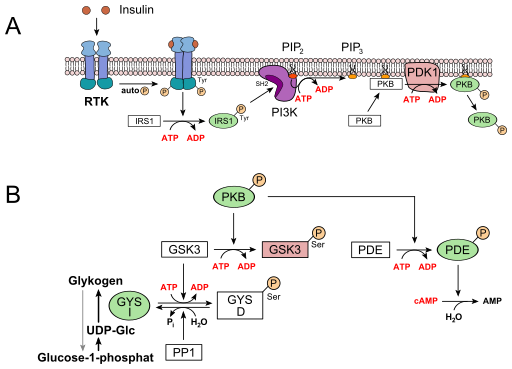 The regulation of glycogen synthase by insulin is fairly complex but follows the same principles of signal transduction as discussed above. Insulin is the first messenger and binds to its receptor (Receptor tyrosine kinase, RTK). This brings the two halves of the receptor together and they cross-phosphorylate (called autophosphorylation) each other on tyrosine residues. The phosphorylated receptor is recognised by the insulin receptor substrate 1 (IRS-1), which in turn becomes phosphorylated itself. The phosphorylated IRS-1 docks onto phosphatidylinositol-3-kinase (PI3K) and activates it. Instead of a water soluble second messenger, such as cAMP, a specific membrane-bound lipid is generated as second messenger, namely phosphatidylinositol-triphosphate (PIP3). It is made by phosphorylation of phosphatidylinositol-diphosphate (PIP2), one of the minor components of the membrane bilayer. PIP3 in turn activates phospholipid dependent kinase (PDK1), which phosphorylates and activates protein kinase B (PKB). Active PKB-Pi, phosphorylates its target glycogen synthase kinase 3 (GSK3), thereby inactivating it. Active GSK3 would normally phosphorylate glycogen synthase (GYS), inactivating it, as well. Thus inactivating GSK3, allows protein phosphatase 1 (PP1), to dephosphorylate glycogen synthase and thereby activating it. Active PKB-Pi has other targets as well, particularly phosphodiesterase (PDE), which becomes active when phosphorylated and hydrolyses cAMP to AMP. This is a safety mechanism to avoid another futile cycle, namely synthesis and breakdown of glycogen at the same time. This is a perfect segue way to look at the regulation of glycogen breakdown (Fig. 14).