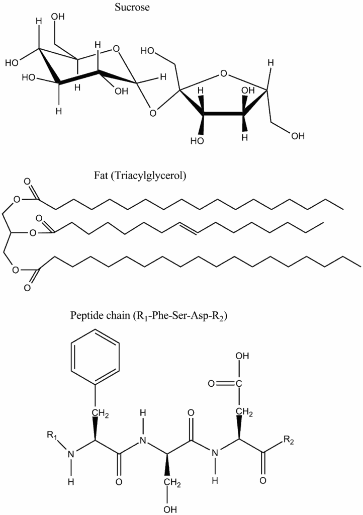 Table 1 demonstrates that fat has a significantly higher energy content per g weight than carbohydrate and protein. The reason for this will become clear when we discuss the metabolism of these compounds. However, just by inspecting the structures of the major food components in Fig. 3 reveals that protein and carbohydrates are more oxidised than fat (i.e. contain more oxygen per molecule).