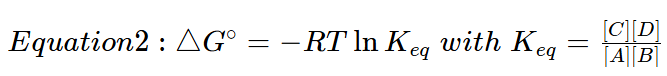 Keq defines the concentrations of substrates and products at equilibrium. R is the gas constant and T the absolute temperature. Any reaction that runs spontaneously towards the products (runs forward towards C and D) will thus have a negative free energy (numerator > denominator), while any reactions that will proceed towards the substrates (runs backward to accumulate A and B) will have a positive free energy.