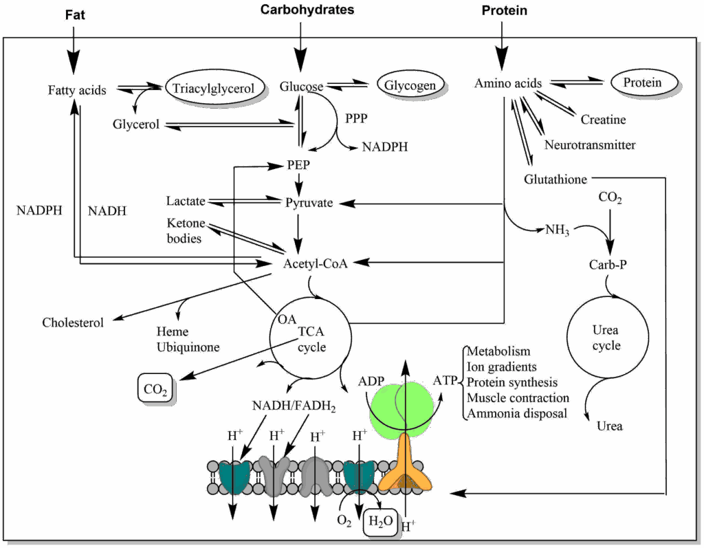 In this book we will follow the metabolism of the three macronutrients and discover how their metabolism converges to generate ATP. Fig 2 may look confusing now, but will become more and more familiar as we discover the metabolism of our major nutrients.