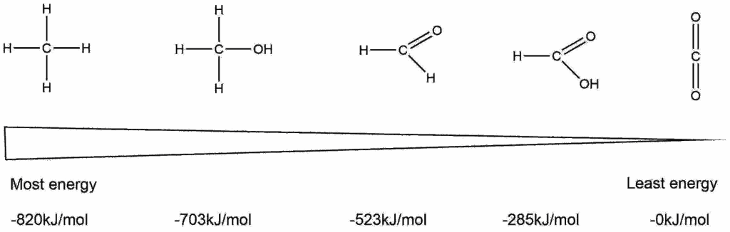 The amount of energy associated with oxidation is illustrated by the burning of organic material. Wood fire logs are largely made up of cellulose, a carbohydrate. These can provide heat energy for long periods of time. Similarly wax and fat can be used to make candles, the burning of which provides energy. Burning is fast oxidation of organic material resulting in the generation of CO2 and H2O. The heat released in this process comes from the rearrangement of atomic bonds during the oxidation process. The more oxidised a molecule is, the less energy can be derived from it. This is nicely illustrated in Fig 4, which shows the energy obtained through full combustion of methane, methanol, formaldehyde, formic acid and carbon dioxide. This explains why fat has a higher energy content per g than carbohydrates and protein.